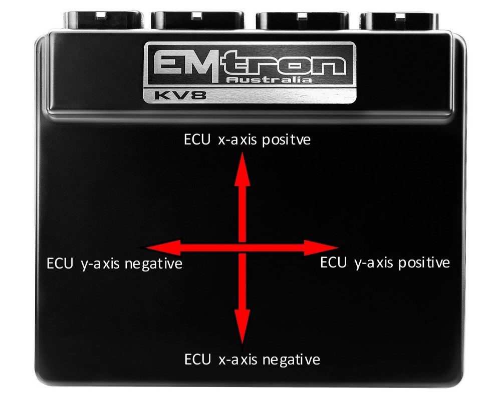 The ECU allows each vehicle axis to be assigned to an ECU axis (X,Y,Z) . For example the Longitudinal Axis can be assigned to the ECUs X or Y or Z axis. This allows the ECU to be mounted at any position/orientation within the car.