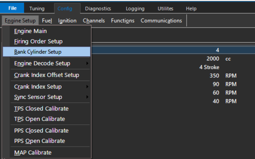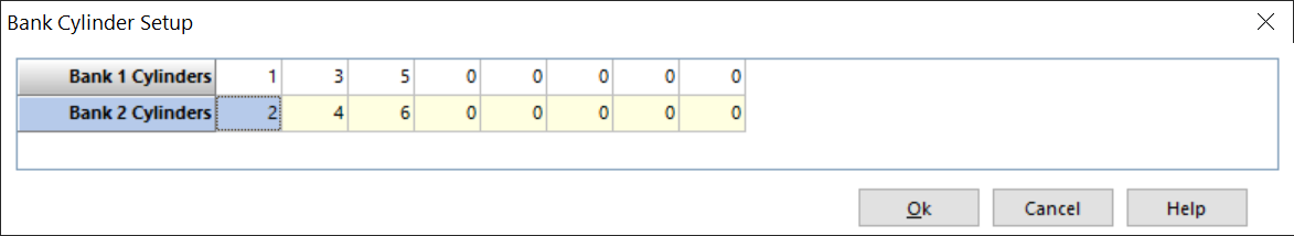 ConfigEngine Setup Bank Cylinder Setup Bank Cylinder Setup Assigns a cylinder number to either Bank 1 or Bank 2. Used in the Bank controlled Fuel Models 5-7.