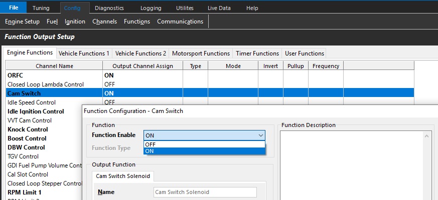 The Emtron ECU Cam Switch function is a comprehensive function to control simple cam switch solenoids