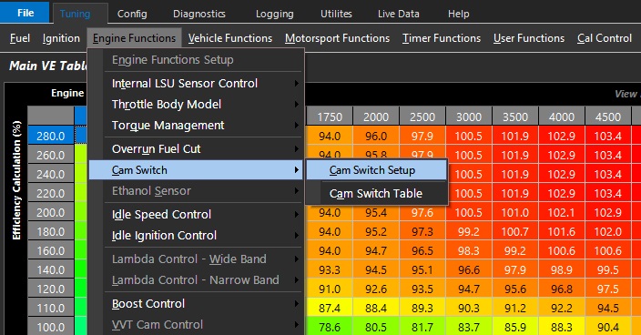 Instead of just having standard switch criteria like a simple RPM or load threshold, the Emtron Cam Switch function has a series of setup functions, plus a 3D table to control its activation.