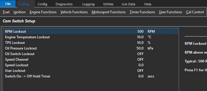Oil Pressure above when the Cam Switch can become active. Only applies if Oil Pressure Input Channel has been configured.