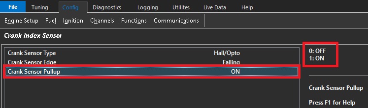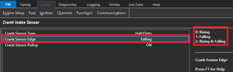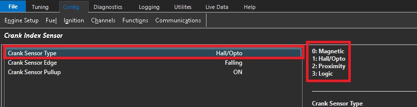 ** When Selecting ANY Pre-Defined Engine Decoding mode (3 +), Crank/Sync Sensor type, Edge configuration, Pull up configuration is all pre-configured for the user. The user should not need to adjust these.