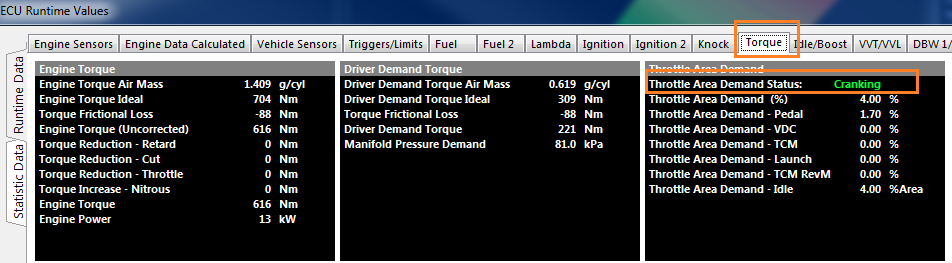 This is available from the runtime (F3) menu , Torque or DBW 1/2 tab.