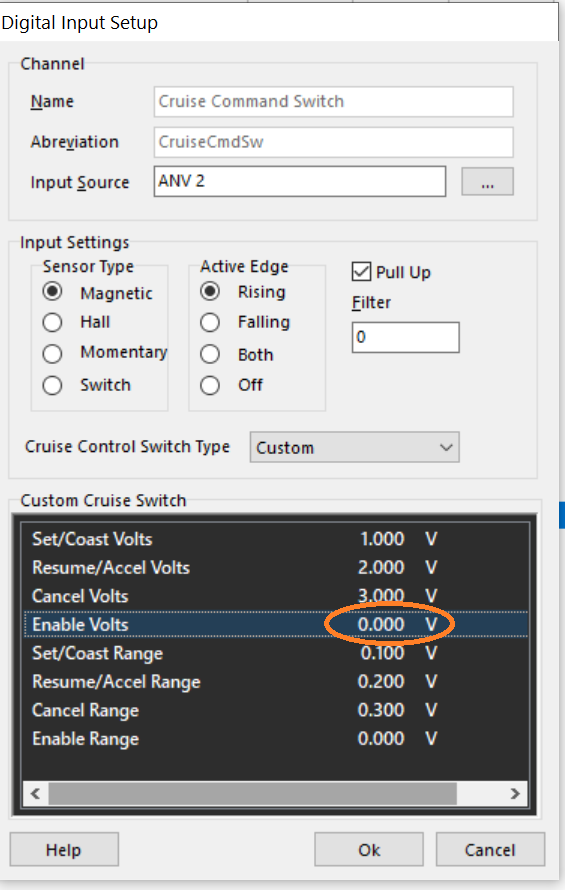 When the Voltage setting = 0.0V the corresponding setting is disabled within the Cruise Command Switch channel. In the below example the "Enable Sw" setting is disabled.