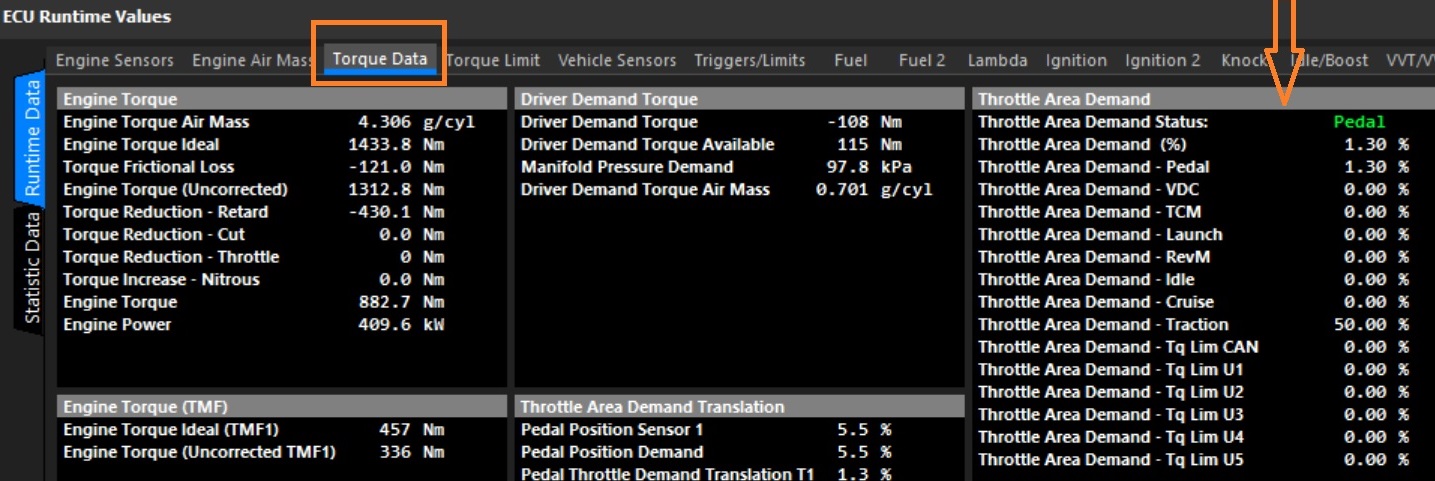 Throttle Area data is available either in the Runtime menu(F3) -> Torque or DBW 1/2 tab. The "Throttle Area Demand Status" indicates the current throttle area in use.
