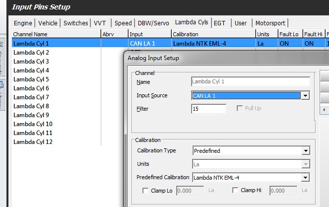 - Select Input -> Input Pins Setup. Select the Lambda Cyls Tab