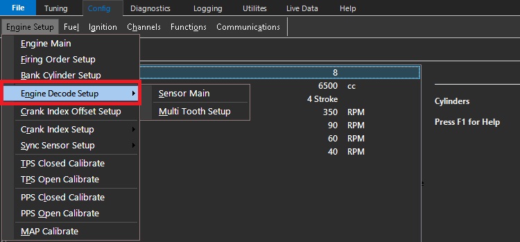 ConfigEngine Setup Engine Decode Setup Engine Decode Setup Engine Decode Setup is where the the engine trigger type is configured. The following settings are configured in this menu : Sensor Main Multi Tooth Setup