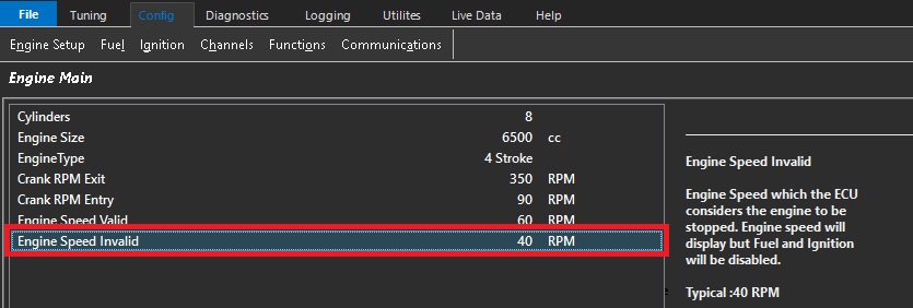 ConfigEngine SetupEngine Main Engine Speed Invalid Engine Speed Invalid Engine Speed which the ECU considers the engine to be stopped. Engine speed will display but Fuel and Ignition will be disabled.