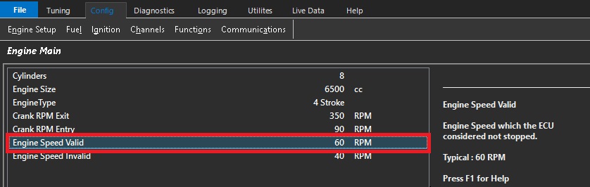 ConfigEngine SetupEngine Main Engine Speed Valid Engine Speed Valid Engine Speed which the ECU considered not stopped.