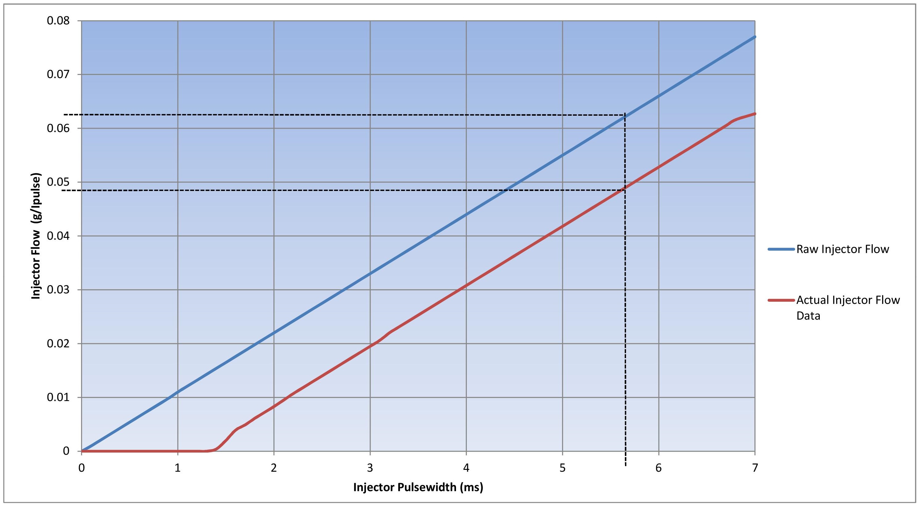 The Graph below of Theoretical vs Actual flow explains this better. The Blue line is the Raw/Theoretical Flow and the Red line is the actual Injector Flow .. note the large error. At 5.7ms the actual fuel mass produced by the injector is 0.0587g instead of the calculated 0.06312 g.
