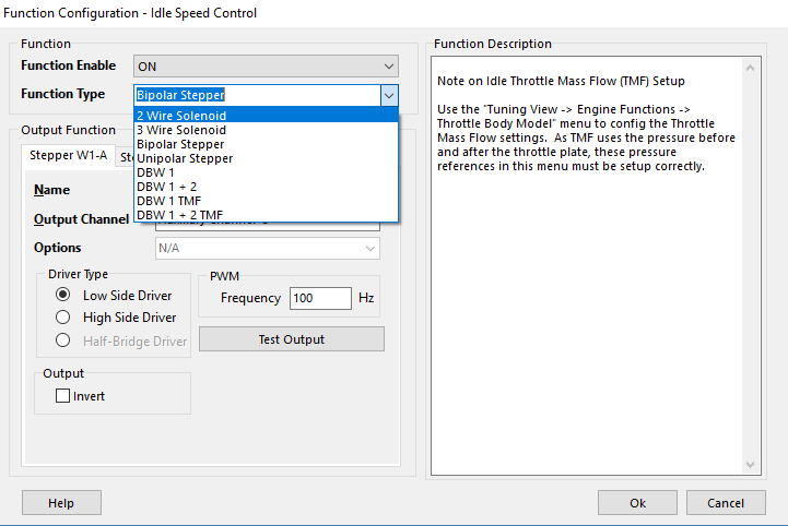 Use the "Tuning View -> Engine Functions -> Throttle Body Model" menu to config the Throttle Mass Flow settings. As TMF uses the pressure before and after the throttle plate, these pressure references in this menu must be setup correctly. See Idle Speed Tuning