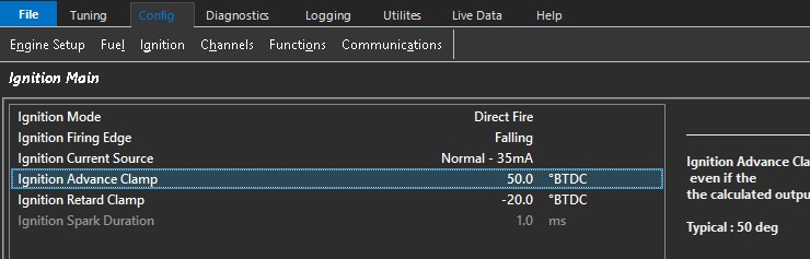 ConfigIgnitionIgnition Main Ignition Advance Clamp Ignition Advance Clamp The maximum ignition advance allowed even if the the calculated output is higher. Typical : 50 deg The ECU also provides a Status flag to indication this condition. Open the ECU Runtimes menu (F3) and select the Ignition Tab.
