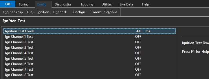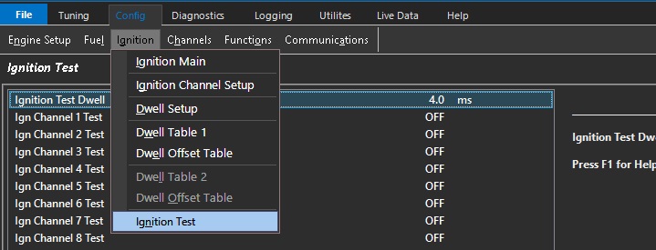 ConfigIgnition Ignition Test Ignition Test The Ignition Test function allows for independent Ignition channel testing for systems check & diagnosis. NOTE: The Ignition Channel must have a cylinder assigned for this function to operate. See "Ignition Channel Setup"