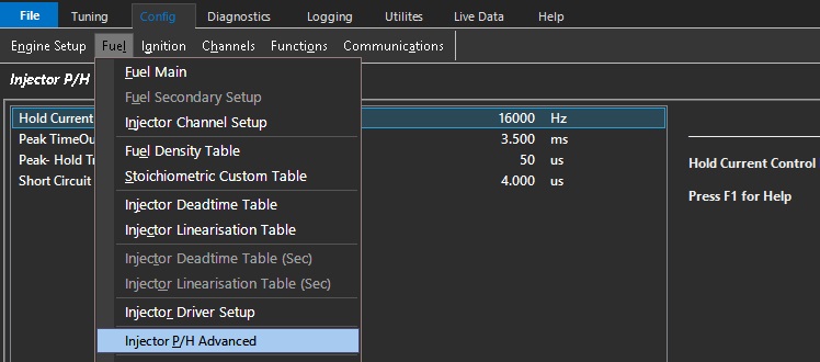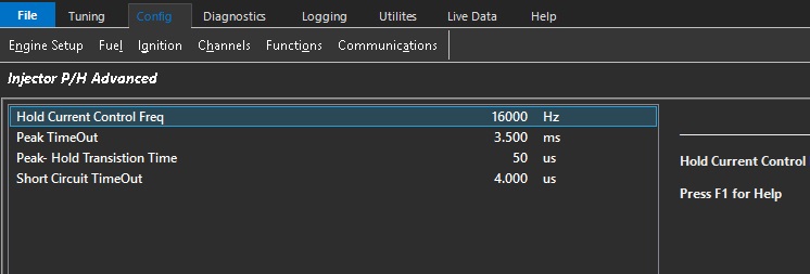 ConfigFuel Injector P/H Advanced Injector P/H Advanced Injector Peak and Hold Advanced This feature allows for user definable hold current & transition timing control of low impedance injector drivers Warning: This is an advanced feature for experienced tuners only.