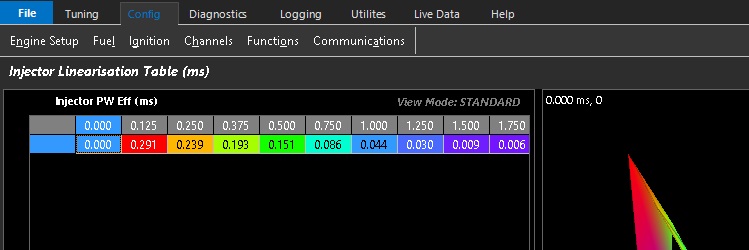 The Injector Linearisation table is a low pulse adder table which uses offset values that vary with pulsewidth, correcting the lower non linear operating range of the injector. Its only used a small pulsewidths and this data is available from most injector manufactures.