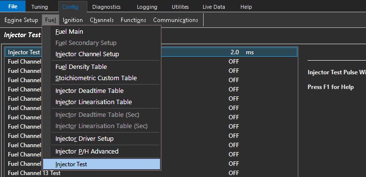 ConfigFuel Injector Test Injector Test Injector test permits individual testing of each injector - Systems check / Diagnostic Tool