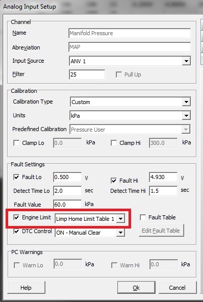This function provides Engine Speed Limiting when a DTC error occurs on an Input Channel. The operation of these table(s) can be controlled independently from each Input Channel setup page.