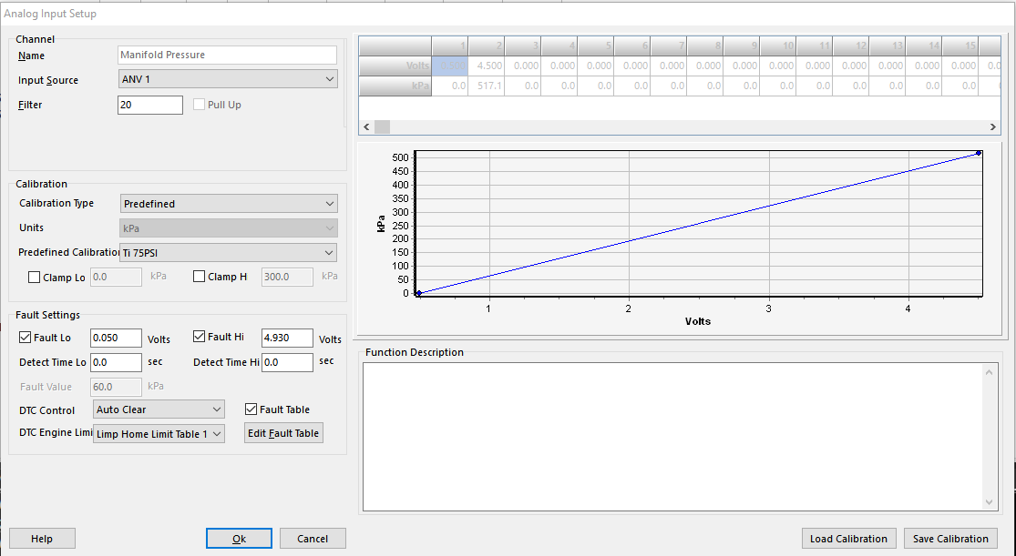 Sensor input source, filter, calibration, clamp, fault settings, fault value (substitute value), DTC control, and DTC engine limit control are all configured here. There are a number of popular “pre-configured” sensor styles.