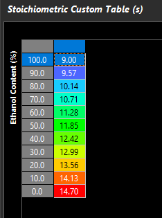 The airflow model will determine air mass flowing through engine a number of ways, then reference the stoich setup to determine how the "Lambda Target" table quantifies the fuel mass needed in the model. There are a number of pre-defined fuel types to choose from, but also a "Custom - Table" selection for pump fuel with ethanol, flex fuel vehicles, etc. See the ECU sample file (Custom - Table), or build your own table if using a odd fuel.