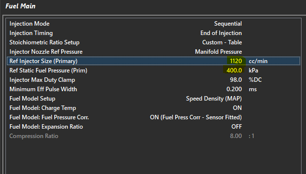 The Ref Injector Size flow rate must match the Ref Static Fuel Pressure value