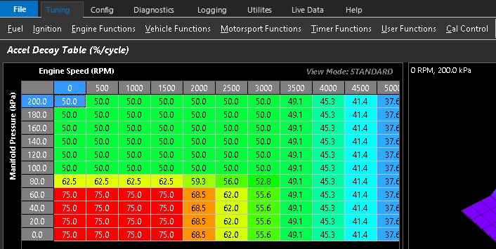TuningFuelTransient Fuel Accel Decay Table Accel Decay Table The Accel Decay Table controls the rate of decay or how quickly the added accel fuel is removed as a percentage of an engine cycle. Example: Accel decay = 10 Accel fuel will decay back 10% every cycle