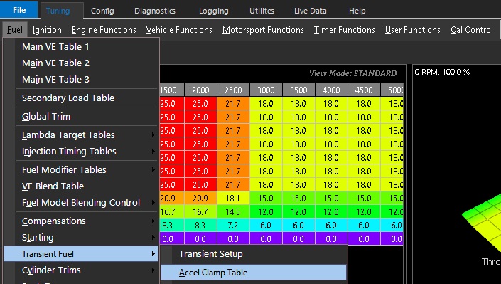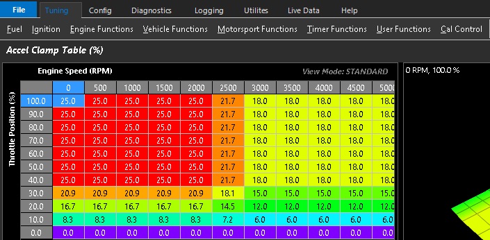 TuningFuelTransient Fuel Accel Clamp Table Accel Clamp Table The Accel Clamp Table limits the maximum amount of increased PW (percentage vs calculated PW) allowed. Example: Accel Clamp = 50% Fuel base pulse width = 4.0ms Max Accel Fuel PW allowed = 2.0ms Total fuel pulse width = 6.0ms