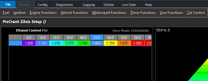 TuningFuelZ-Axis Setup PreCrank Z-Axis Setup PreCrank Z-Axis Setup The Z-Axis activates a user definable X-Axis to swap or blend between PreCrank tables based on the selected runtime PreCrank ZAxis spanned across ethanol content example shown above