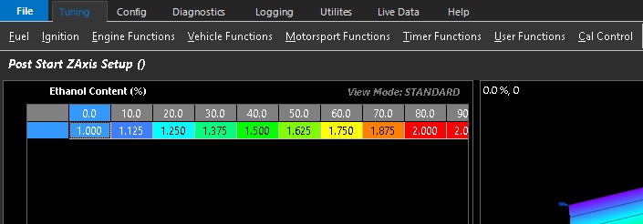 TuningFuelZ-Axis Setup Post Start Z-Axis Setup Post Start Z-Axis Setup The Z-Axis activates a user definable X-Axis to swap or blend between Post Start tables based on the selected runtime Post Start ZAxis spanned across ethanol content example shown above