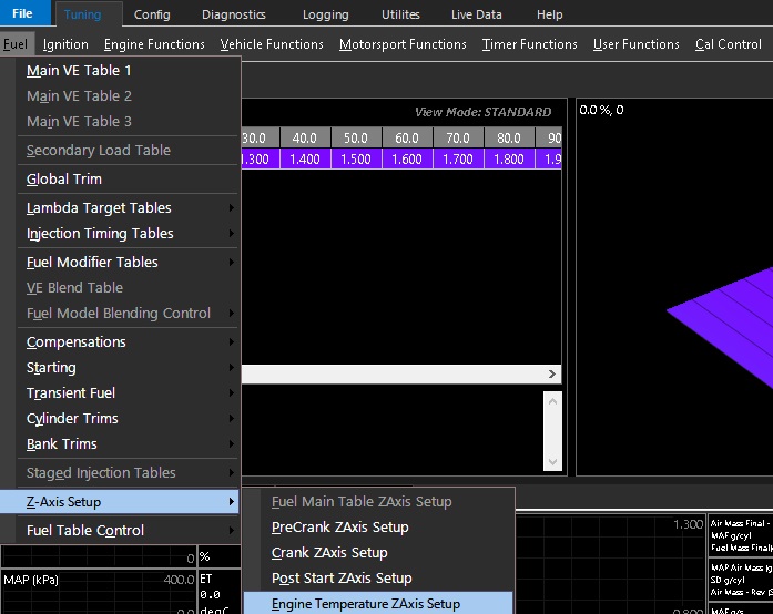 The Z-Axis activates a user definable X-Axis to swap or blend between Engine temperature Compensation tables based on the selected runtime