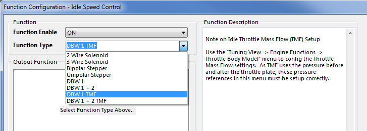 - Configure the Throttle Mass Flow Idle Speed Control output function type using the menu:
