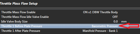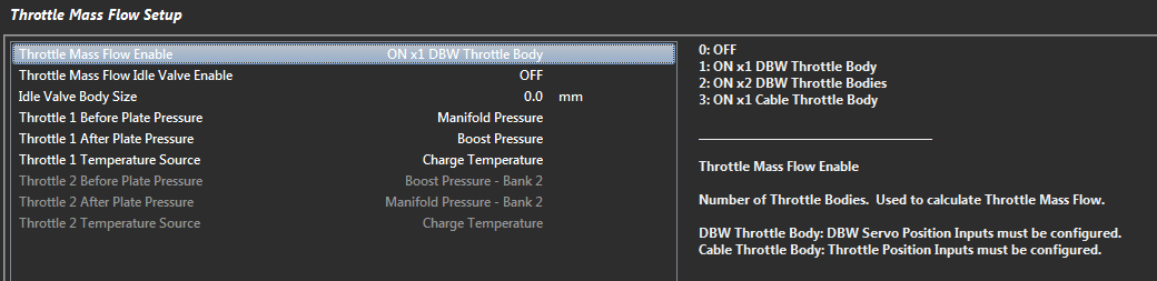 Step 1- Select the throttle mass flow enable type that is applicable to your configuration. Example: ON x 1 DBW Throttle Body