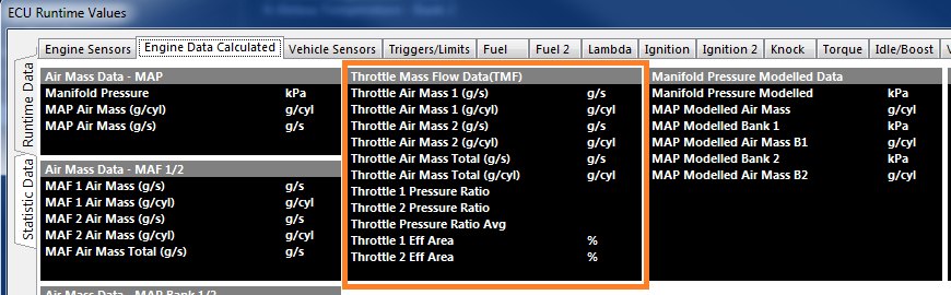 - Confirm the Throttle Mass Flow calculations are operating, the data can be viewed from the Runtime menu (F3) -> Engine Data Calculated tab