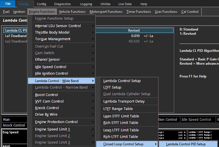 TuningEngine FunctionsLambda Control - Wide Band Lambda Control PID Setup Lambda Control PID Setup 0 - Standard = Basic P Gain Controller 1 - Revised = More advanced PI Gain Controller La1 Deadband - Deadband for CL to operate within for Lambda Sensor 1 La2 Deadband - Deadband for CL to operate within for Lambda Sensor 2