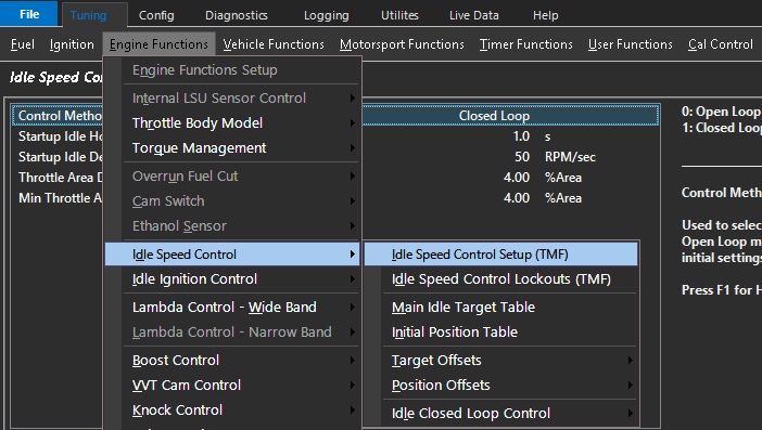 Tuning –> Engine Functions –> Idle Speed control –> Idle Speed Control setup (TMF)