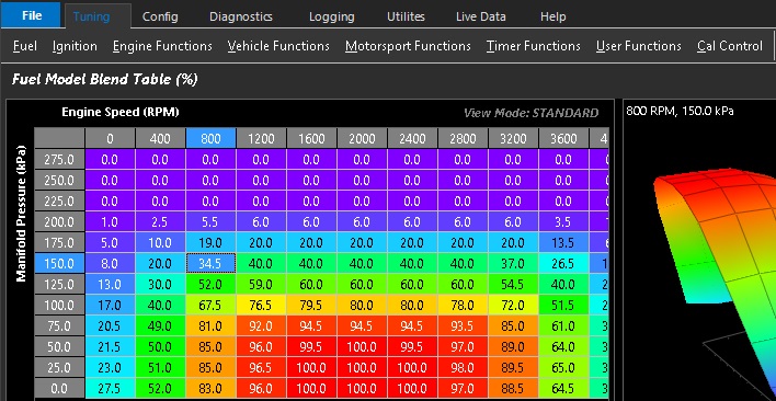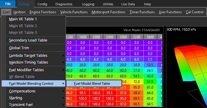 The fuel model blending control table is accessed from : Tuning -> Fuel -> Fuel Model Blending Control