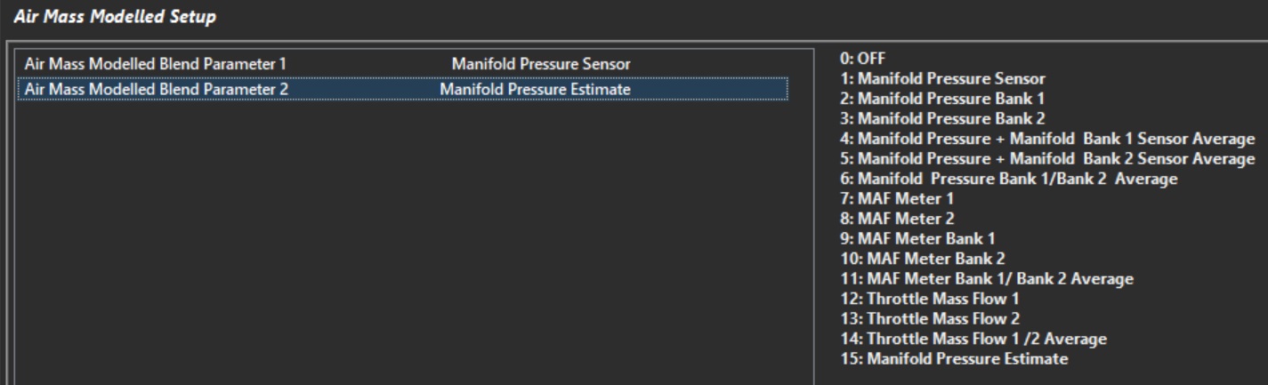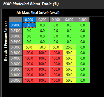 This mode generates new calculated runtime called "Air Mass Modelled (g/cyl)" which is a blend of two different air mass parameters. The "Blend Table"