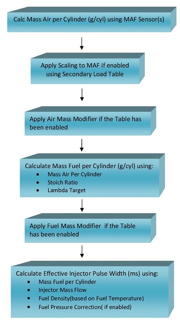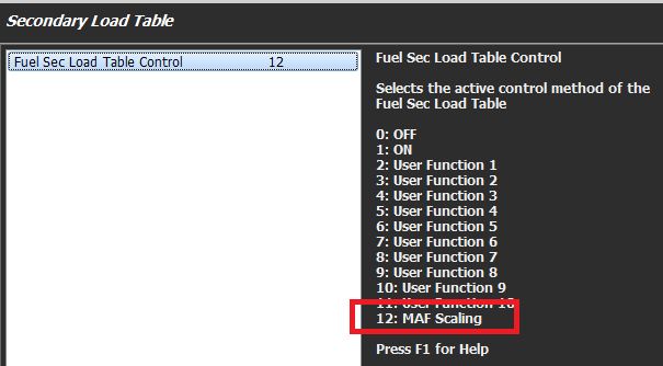 Once the Mass Air has been measured, if the MAF requires further scaling this can be done using a 3D Table. In the real world "small" corrections will need to be applied. This can be done using the Secondary Load Table which will allow a +/- percentage correction to be applied.