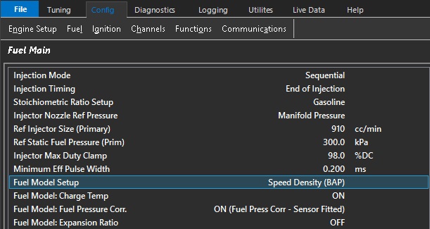 ConfigFuelFuel MainFuel Model Setup 1: Speed Density (BAP) Speed Density(BAP Sensor) Speed Density (BAP) mode is predominantly used in TPS only tuning methods. This mode uses the same Fuel Model and equations as listed for mode 0, the only difference is the MAP sensor is replaced with the BAP sensor.