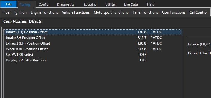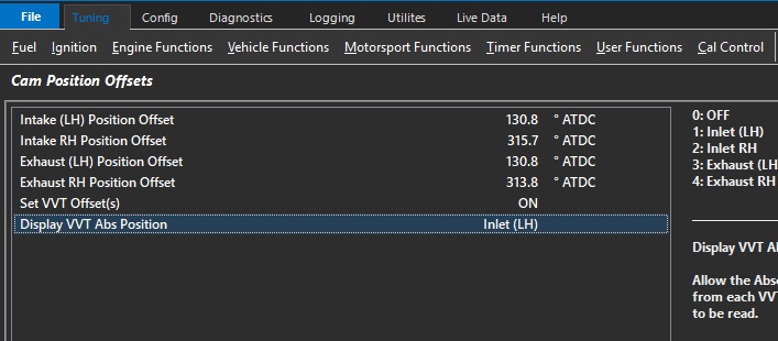Once completed for each cam, set VVT Offset(s) to = 0 (Off)