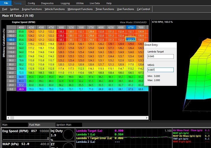 "M" is pressed & the Lambda target value is imputed together with the measured value. Enter and the result is applied to the highlighted cell.