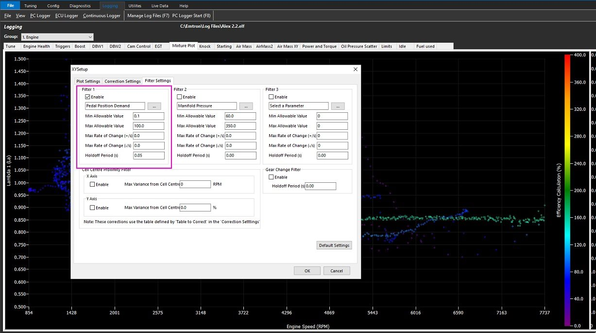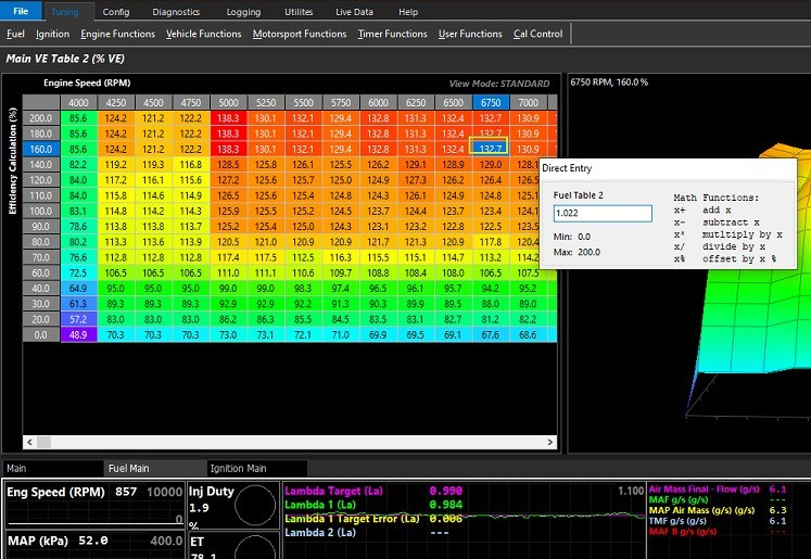 Tuning tables can be quickly validated by utilising the “P” key to pause the live logging in the dashboard independent of the PC logging. This will allow you to drive through an area of a particular table, press “P” & then come back & edit where you have been.