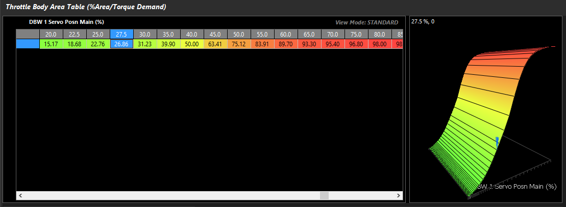 ** If Throttle Body Area is worked out, then Pedal to Throttle Demand Translation Table will not match DBW initial position, and the raw position needed will need to be matched vs Throttle Body Area