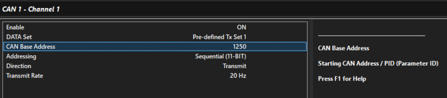In the above example, Pre-defined Tx Set 1 send it's first frame on ID 1250. The whole data set contains 10 frames. They're sent out incrementally from 1250.