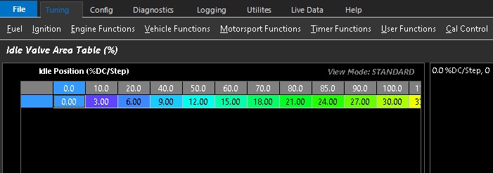 The Idle Valve Area Table % allows setting & adjustment of the correlation between Idle Valve Area and the Idle valve step position or duty cycle. These values then feed into the airmass calculation and add to the Throttle Area Demanded and Throttle Effective Area