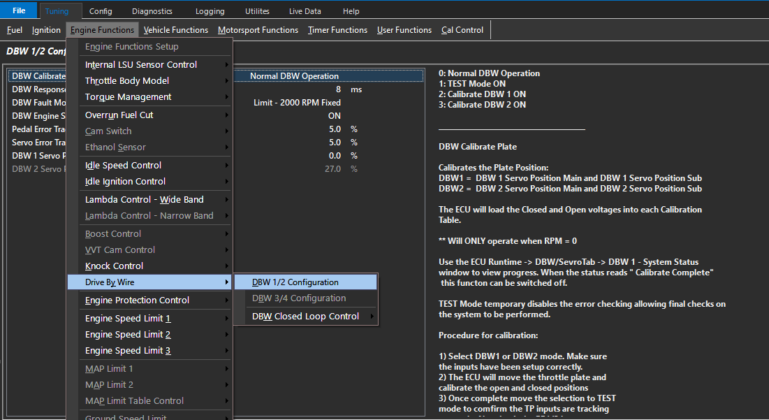 ** To calibrate DBW plate position (with fully configured inputs/outputs), this is done in the Tuning Section, as generally the PID and other functions must be "tuned" as well - Tuning -> Engine Functions -> Drive By Wire -> DBW 1/2 Configuration