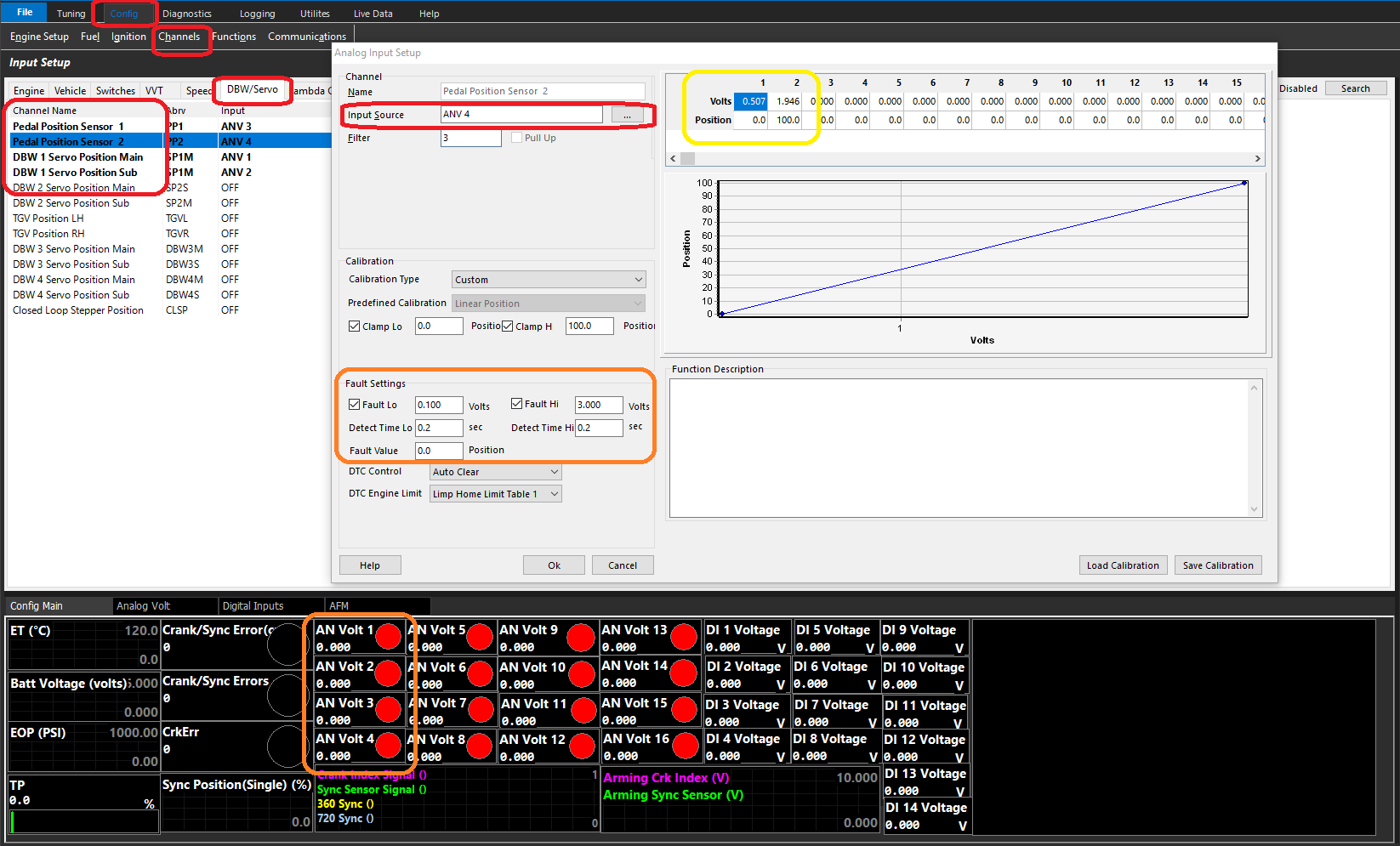 Validation of the programmed voltages can be observed under the input setup Config -> Channels -> Input Setup. Find the PP/DBW sensors under the DBW tab, or the TPS sensor under the Engine tab (depending which was calibrated), and you can validate if the programmed voltages are correct if there are any issues.