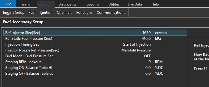 ConfigFuelFuel MainFuel Secondary Setup Ref Injector Size (Sec) Ref Injector Size (Sec) Flow Rating of the Secondary injectors at the reference static fuel pressure