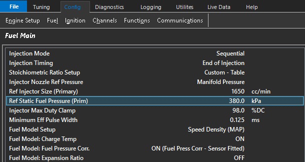 It is important that this setting is correct especially when the fuel pressure is enabled as part of the "fuel model".