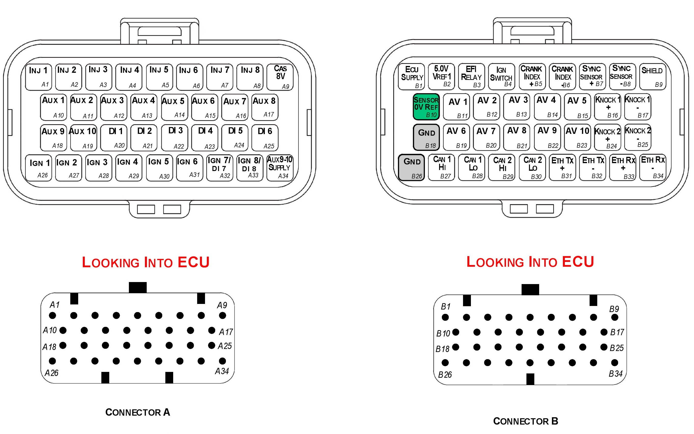 - DO NOT connect the ECU pin B10 directly to the Engine Block or ECU Ground. These are dedicated and specialised ground outputs for all analog channels and should be connected directly to the sensor.