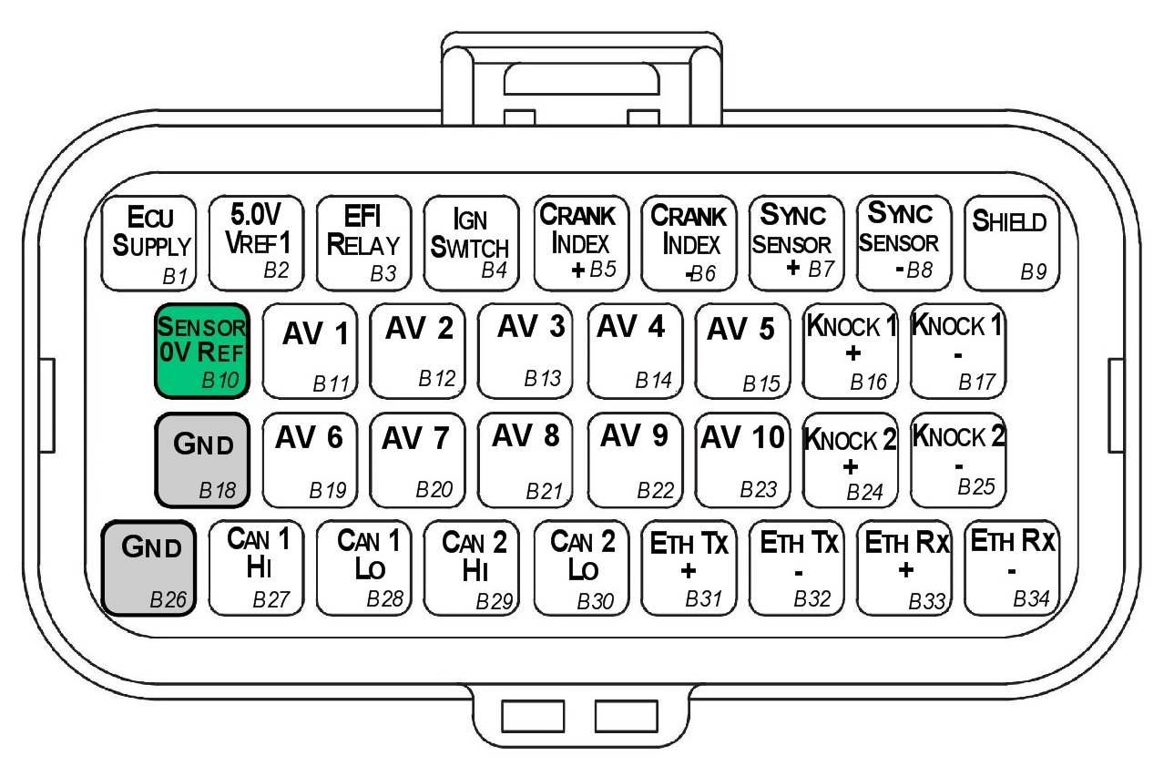 - DO NOT connect the ECU pin B10 directly to the Engine Block or ECU Ground. These are dedicated and specialised ground outputs for all analog channels and should be connected directly to the sensor.